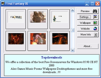 Se você é fã de carteirinha da série Final Fantasy, essa mistura de protetor de tela e papéis de parede vai incrementar o seu computador. O Final Fantasy IX Screensaver inclui 17 imagens do nono jogo da série e dos famosos personagens.